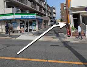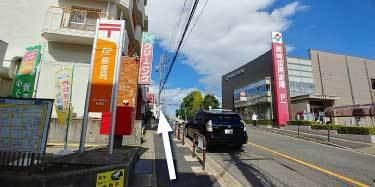 ファミリーマートの前を渡ると右手に郵便局があります。その先を道なりに進みます。