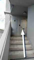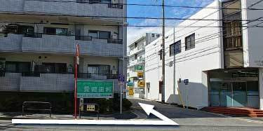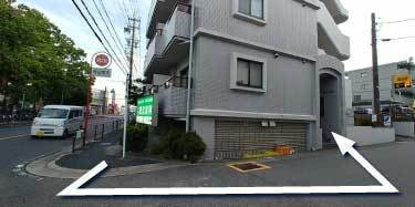 「愛建歯科」の看板があるマンションです。右に曲がるとマンションの入口です。